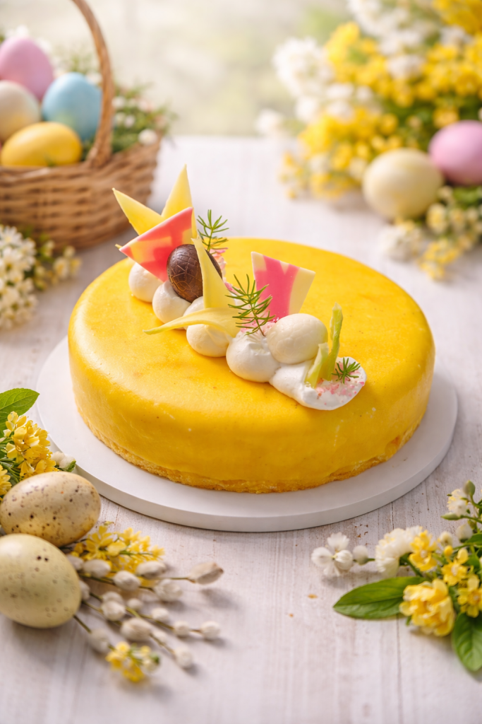 Romige witte chocolade ijs met een kern van mango-passievruchtijs en perzik sinaasappel variagato. Deze heerlijke taart is omhult met een fruitige mango coating en afgewerkt met paasdecoratie.